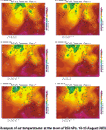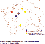 The most significant episode of high ground-level ozone concentrations occurred between 12 and 14 August 2003. During the monitored period the anticyclone of 1020 hPa with the centre above southern Hungary moved across northern Italy to southern Spain and enabled the shift of the frontal zone from northern to central Europe. On the rear side of this anticyclone very warm air from south came at first to western, later also to central Europe. At the end of the period two subsequent cold fronts came from northwest to the territory of the Czech Republic and the air masses exchanged. On 12 August the whole territory of the Czech Republic had mainly somewhat cloudy weather, with non-measurable precipitation. Maximum temperatures reached 36 C in Bohemia, in Moravia 32 C. On the following day the weather was somewhat cloudy, temporarily cloudy, in late afternoon and night hours cloudy to overcast with showers and storms. The amount of precipitation ranged from non-measurable values to 11 mm; the higher totals were recorded in the north, the lower in the south. Maximum temperatures reached 36–39.5 C. On 14 August the weather was somewhat cloudy to cloudy with abundant precipitation (in Bohemia up to 13 mm, in Moravia up to 17 mm). Maximum temperatures in Bohemia reached 33 C, in Moravia 36 C. On 12 August within the very warm air mass moving over the territory of the Czech Republic in the west–east direction (Fig. 2.3.2) the maximum values of ground-level ozone exceeded 180 μg.m-3, at first only in the western part of Bohemia (Fig. 2.3.3, Fig. 2.3.4, Fig. 2.3.5), on 13 August 2003 almost on the whole territory of the Czech Republic except for the Ostrava Region, hot spots in Prague, and in Plzeň, Brno, Teplice and Jeseník as well. Approximately on the half of the territory of Bohemia and in small areas in southeastern Moravia the maximum concentrations exceeded 200 μg.m-3 with the highest value of 235 μg.m-3 in Pardubice. (Fig. 2.3.6, Fig. 2.3.7, Fig. 2.3.8). On 14 August 2003, after the passage of two cold fronts across Bohemia and major part of Moravia the ozone concentrations declined to 140–160 μg.m-3, the value of 180 μg.m-3 was exceeded only in southeastern Moravia and at Churáňov (Fig. 2.3.9, Fig. 2.3.10, Fig. 2.3.11). More significant episodes with ground-level ozone concentrations above 300 μg.m-3