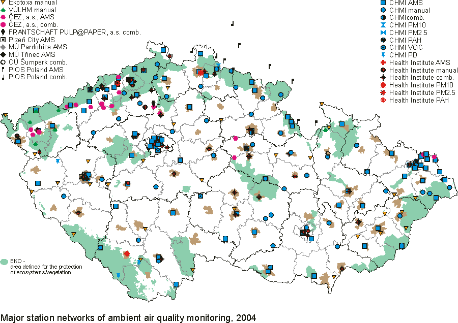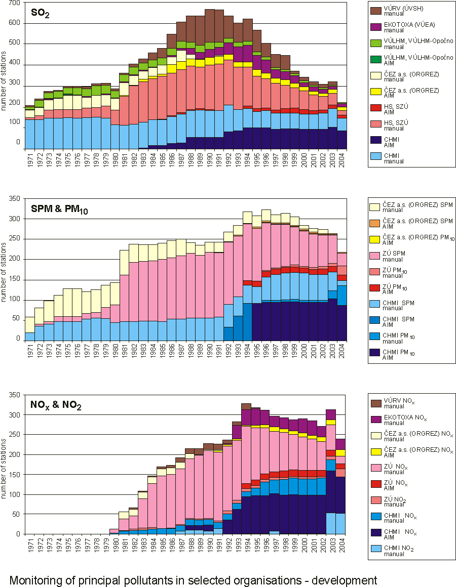 2. AMBIENT AIR POLLUTION LEVELS IN THE CZECH REPUBLIC 2.1 Networks of Ambient Air Quality Monitoring Stations The ambient air pollution situation has been assessed based on the data archived in the ISKO air pollution database. In addition to the data from CHMI networks, several other organisations that play an important role in air pollution monitoring in the Czech Republic have also been contributing to the ISKO database for a number of years. As it was stated in the Preface, since 1996, the data for the German part of the Black Triangle has been included and presented in the air pollution ISKO database, and the data for the Poland part of the so called Black Triangle has been included since 1997 likewise. In early 2000 the objective need of air pollution network optimization was stated in order to provide the state bodies with the necessary information for the whole Czech Republic territory and the tools for fulfilling the tasks set by the respective EU directives and by the obligations ensuing from international agreements adopted by the Czech Republic in the field of air quality protection. Simultaneously the urgent need emerged to innovate the instruments worn down by continuous operation which resulted in ever increasing failure rate. Within the R&D project the Draft of the optimalized network of air quality monitoring was presented followed up in 2002 by the Implementation project of the National air pollution network (SIS) including the AIM network and the supplementary network with manual sampling. The SIS project, pursuant to 6, Art. 8 and 7, Art. 5 of the Clean Air Act No. 86/2002 Coll., aimed at ambient air quality monitoring in the whole territory of the Czech Republic, and namely in the areas with deteriorated air quality. The project also considered new knowledge and requirements concerning the monitored pollutants, as well as the change in the emission situation in the Czech Republic. Pollutants monitoring within the national air pollution network was aimed mainly at the pollutants with the set limit values. It was supposed that the proposed SIS, operated by one authorized organization, is the basic component of air quality monitoring in the Czech Republic. If necessary it can be combined with and use the data from the specialized networks of other organizations or the stations operated at a lower level (regions and selected basic administrative units). This network, established with the PHARE project contribution, was launched on 1 January 2004. Table 2.1.1 provides the overview of the number of localities in individual regions, broken down by the owners operating the respective monitoring network. Usually only one measuring programme is installed per the respective locality. Several localities, particularly the CHMI ones, operate more than one measuring programme, for example those at Prague 4-Libuš, Košetice, Ústí n. L.-Kočkov, Bílý Kříž and some others at which automatic, manual and semiautomatic measuring programmes have been installed, as also those intended for the monitoring of PAHs and heavy metals. The registration of stations together with the type of their measurements is updated on an annual basis. In addition to the number of registered stations and the number of registered measurements, the number of active localities is also mentioned, calculated on the basis of the actual reception of data from these stations by the ISKO air pollution database in any given year. Table 2.1.2 lists the number of air pollution monitoring localities broken down by regions at which basic pollutants are monitored automatically. At AIM stations the pollutants are measured by continual analysers and the measured concentrations are as 1 hour averages transmitted in real time via switched lines or via radio transmission for further processing. Table 2.1.3 shows the number of localities in individual regions at which further pollutants, incl. supplementary meteorological parameters are monitored automatically. Table 2.1.4 lists the number of localities in individual regions at which the listed pollutants are monitored by manual methods. Table 2.1.5 presents the total numbers of localities in individual regions with special measurements using manual methods. Network density in each of the Czech Republics regions and monitoring organisations involvement are illustrated in Fig. 2.1.1. The graph in Fig. 2.1.2 illustrates how the measurement of principal air pollutants has developed since 1971, using the data archived in ISKO database for the organisations and network types listed. The production of maps of air pollution characteristics presented in this Yearbook is guided by the classification of the measuring stations carried out within the research project VaV/740/2/00 Evaluation of the Czech Republic Readiness to Meet Air Quality Requirements of EU Directives and the LRTAP Convention [3] and further developed. This classification is based on the Council Decision 97/101/EC on exchange of information (EoI) [4] and Criteria for EUROAIRNET [5]. The requirements of the Council Decision 97/101/EC are obligatory for the EU Member States. Due to the fact that this is the only official European classification it has been applied to all air pollution stations in the Czech Republic registered in the ISKO database. The application is described in Sládeček, J., Blažek, Z. (2000): Application of criteria for the classification of stations and station networks pursuant to the EoI Decision 97/101/EC and Criteria for EUROAIRNET to the stations included in the air quality assessment process. The Report on the task DU01-1.E1 of the R&D Project VaV/740/2/00, CHMI, Prague. The EoI classification was simplified by the Decision of the European Commission 2001/752/EC. The character of the location of some monitoring stations in the Czech Republic, however, corresponds rather with the classification in the original version of 1997 and thus it continues to be used in the ISKO database. The Yearbo