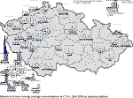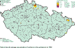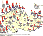 areas with deteriorated air quality. Tab. 2.2.4 Stations with the highest numbers of exceedences of the 24-hour limit value of SO2 Tab. 2.2.5 Stations with the highest values of annual average concentrations of SO2 Fig. 2.2.1 4th highest 24-hour concentrations and annual average concentrations of SO2 in 1992–2004 at selected stations Fig. 2.2.2 Field of the 4th highest 24-hour concentration of SO2 in 2004 Fig. 2.2.3 Stations with the highest hourly concentrations of SO2 in 2004 Fig. 2.2.4 Stations with the highest 24-hour concentrations of SO2 in 2004 2.2.2.2 Suspended particles, PM10 fraction Air pollution caused by PM10, as shown in the Tables 2.2.6 and 2.2.7, similarly as in Fig. 2.2.5, remains one of the main problems of air quality assurance with regard to the requirements and deadlines of the legislation. Fig. 2.2.5 shows the increasing trend of PM10 pollution at almost all stations in the Czech Republic from 2001 to 2003. In 2004 this trend stopped and, on the contrary, the PM10 concentrations decreased at almost all selected stations. From the meteorological aspect the year 2004 was much wetter than the year 2003, which, on the contrary, was extremely dry. This fact was apparently the main cause of the decline of PM10 concentrations in 2004 as compared to 2003. The most affected area of large coverage is, similarly as in the previous years, the Ostrava Region. The limit value of 24-hour PM10 concentration increased by the margin of tolerance was exceeded more than 35x in 2004, and namely at the stations in the Moravian-Silesian Region (Bohumín, Český Těšín, Havířov, Ostrava-Přívoz, Karviná, Ostrava-Zábřeh, Věřnovice, Ostrava-Fifejdy and Frýdek-Místek), at the stations in Prague (Smíchov and Legerova), at one station in the Central Bohemian Region (Kladno-Švermov) and in Ústí nad Labem Region (Horní Jiřetín, Ústí n. L.-město and Děčín). Of the total number of 94 stations at which PM10 measurements were carried out, 55 stations reported exceedences of 24-hour PM10 limit value more than 35x and 42of them reported even exceedences of the limit value including the margin of tolerance. The annual PM10 limit value was exceeded at 17 stations, and all of them exceeded also the margin of tolerance. The number of localities at which both above air pollution characteristics of PM10 fraction exceeded the limit value decreased in 2004. This was not caused by the improvement of air quality but in fact by meteorological conditions (the year 2003 was extremely dry). Figs. 2.2.6 and 2.2.7 show that PM10 limit value exceedences are, in spite of certain decrease of PM10 concentrations in 2004 as compared to 2003, still significant for listing the basic administrative units among the areas with deteriorated air quality. The limit value for 24-hour PM10 concentration was exceeded more than 35x mainly in Moravian-Silesian, Ústí nad Labem, Central Bohemian and Olomouc Regions and in Prague also in 2004. Fig. 2.2.6 shows quite evidently that in the towns where the PM10 measurements are carried out the result concentrations of this pollutant are above the limit value. However, it can be admitted that in the towns without PM10 measurements the concentrations exceed the limit value as well. The model application is difficult in this case as the model calculations include only the emissions from primary sources. The significant share in PM10 pollution is contributed by secondary particles1 and re-suspended particles, not included in the emissions from the primary sources. The areas where PM10 concentrations exceed the respective limit values represent almost 3.5 % of the territory of the Czech Republic with more than 34 % of the total population. The graphs of courses of 24-hour concentrations in 2004 at the stations, where the limit value including the margin of tolerance was exceeded, are shown in Fig. 2.2.8. The selection of 12 stations with the greatest number of LV+MT exceedences includes 9 stations from the Moravian-Silesian Region. 1Defined in [22] as: Particulate matter originated from