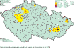 protected landscape areas. 2.2.4.1 Sulphur dioxide The results of air pollution monitoring with regard to the limit value for the protection of ecosystems is shown in the Table 2.2.25 and in Figs. 2.2.37 and 2.2.38. None of the total number of 21 stations classified as rural – EKO (stations in the EKO zones meet at least one of the above a, b, c condition), which supplied data valid for the year 2004, reported the exceedence of the limit value for annual average concentration. Similarly, no EKO station reported the limit value exceedences for the 2004/2005 winter average concentration (Table 2.2.25). Fig. 2.2.37 demonstrates the significant improvement of air quality with regard to sulphur dioxide after 1997 in connection with coming into force of the Act No. 309/1991 Coll. and meeting the set emission limit values by the end of 1998. Most rural stations recorded slight decline in SO2 pollution in the 2004/2005 winter average, which is probably connected with somewhat higher temperatures as compared to the previous winter period 2003/2004. The map in Fig. 2.2.38 shows that in 2004 exceedences of the limit value occurred only occasionally and in the areas which are not included within the defined territories for the protection of ecosystems and vegetation, further in very small parts of the Krušné hory Mts. and České středohoří Mts., where the limit value exceedences do not reach even 0.05 % of the area of the defined territories for the protection of ecosystems and vegetation. Somewhat increased SO2 concentrations ranging between 12–20 μg.m-3 in the area of eastern Bohemia were calculated using the numerical model. The map was constructed from the data of all the stations measuring SO2. The spot symbols highlight only the rural stations determined for the assessment of ecosystems and vegetation. Fig. 2.2.37 Winter average concentrations of SO2 in 1992/1993–2004/2005 at selected stations Fig. 2.2.38 Field of average concentration of SO2 in the winter period 2004/2005