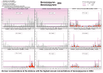 2.2.2.12 Benzo(a)pyrene The natural background level of benzo(a)pyrene is almost zero with the exception of wildfires [15]. The cause of the presence of this main representative of polycyclic aromatic hydrocarbons (PAHs) in the ambient air is, similarly as in other PAHs the insufficient burning of fossil fuels both in stationary and mobile sources, and also some technologies, as coke and iron production. Stationary sources are represented mainly by local heating. Mobile sources are represented mainly by diesel motors. Benzo(a)pyrene as well as several other PAHs are classified as proven human carcinogens [15, 19]. In 2004 benzo(a)pyrene was monitored at 16 stations (9 CHMI and 7 ZÚ) of which 5 stations (in Ostrava, Karviná, Prague, Ústí nad Labem, Hradec Králové) report regular and long-term exceedences of the set limit values (Fig. 2.2.29). In 2004 the limit value was exceeded at 9 stations in the following cities: Ostrava, Karviná, Ústí nad Labem, Prague, Plzeň, Hradec Králové and Teplice. The limit value of the annual concentration was reached at the station Pardubice Dukla (Table 2.2.19). The station Prague 5-Smíchov which measures the increased benzo(a)pyrene concentrations is not included in the Table 2.2.19 as there was not reached the valid annual average. The field of annual average benzo(a)pyrene concentrations (Fig. 2.2.30) prepared with the use of combination of emission dispersion models and the measured concentrations illustrate the significant contribution of this component in the delineation of the areas with deteriorated air quality. The areas where the limit values were exceeded represent almost 3 % of the states territory with about 23 % of the population. However, it is necessary to consider that the estimates of the fields of annual average benzo(a)pyrene concentrations bear the greatest uncertainties which result both from insufficient measurement density and from uncertainties given by dispersion modelling of PAHs emissions; PAHs emission inventories represent the largest source of uncertainties. In 2004 benzo(a)pyrene measurements were extended within the national network and there were more valid annual average concentrations available than in the previous years. The future assessments will thus be based on more measurement results for creating the fields of concentrations. Further, it is necessary to note that even in the basic administrative units where there are no measurements and which are not included in the map of air pollution the increased and above-the-limit-value benzo(a)pyrene concentrations may occur due to the local sources. Tab. 2.2.19 Stations with the highest values of annual average concentrations of benzo(a)pyrene Fig. 2.2.30 Annual average concentrations of benzo(a)pyrene in 1997–2004 at selected stations Fig. 2.2.31 Field of annual average concentration of benzo(a)pyrene in the ambient air in 2004 Fig. 2.2.32 24-hour concentrations at the stations with the highest annual concentrations of benzo(a)pyrene in 2004