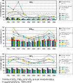 2.2.2.14 Trends of annual air pollution characteristics of SO2, PM10, NO2 and O3 for the period 1995–2004 Fig. 2.2.33 shows the trends of SO2, PM10, NO2 and O3 annual air pollution characteristics in the Czech Republic for the period of 1995–2004. Up to the year 2000 air pollution caused by SO2, PM10 and NO2 had a decreasing trend in the whole Czech Republic. In SO2 and PM10 concentrations the decline was very steep up to the year 1999. In 2001 the decreasing trend was interrupted in the whole Czech Republic and, on the contrary, a slight increase of SO2 and NO2 concentrations and a significant increase of PM10 concentrations occurred. In 2004 this increasing trend of air pollution caused by PM10 and NO2 finished and, on the contrary, certain decrease of PM10 and NO2 concentrations occurred, reaching almost the levels of the year 2001. Since 2003 a slight decrease of SO2 concentrations has been observed. In O3 there is an apparent decreasing trend up to 1997. In 1998–2002 the O3 concentrations stagnated. In 2003 the measured concentrations increased to the levels reached in 1994. In 2004, however, this graph shows that O3 decreased approximately to the level of the year 2001. Fig 2.2.34 shows the trends of SO2, PM10 and NO2 annual air pollution characteristics in 1995–2004 (PM10 since 1996) for the following agglomerations: Prague, Ústí n. L., Ostrava and Brno. Up to 1999 there was a significant decreasing trend in SO2 and PM10 concentrations in the agglomerations, the NO2 concentrations decreased only slightly. In 2001 the decreasing trend was interrupted and, on the contrary, the SO2 and NO2 concentrations slightly increased; PM10 concentrations increased significantly, mainly in the Ostrava agglomeration. In 2004, on the contrary, concentrations of all substances monitored in the agglomerations decreased with the exception of a slight increase of SO2 concentrations in the Ústí n. L. agglomeration. The cause of the mentioned decrease in the year 2004 as compared to 2003 is to be found in high air pollution levels in 2003 due to extremely unfavourable meteorological conditions (extremely dry year). Fig. 2.2.33 Trends of SO2, PM10, NO2 and O3 annual characteristics in the Czech Republic, 1995–2004 Fig. 2.2.34 Trends of SO2, PM10 and NO2 annual characteristics in agglomerations, 1995–2004