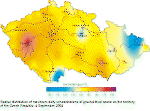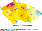 January and February 2004 had significant differences as concerns temperatures. The average monthly temperature in January was –3.9 C with the deviation –1.1 C from the normal, the February average temperature reached 0.4 C with the deviation +1.5 C. November and December were slightly above normal, the November average monthly temperature was 3.2C with the deviation from the normal +0.5 C and December had the average monthly temperature –0.8 C with the deviation from the normal +0.2C. The above-normal temperatures in February 2004 resulted from the creation of the leading anticyclone of 1035 hPa above the Mediterranean Sea, when from 1 to 8 February 2004 warm air from south-west came above the territory of the Czech Republic along the northern edge of the anticyclone. According to the measurements of the station Prague-Libuš the long-term normals were exceeded by 8–13 C. The positive deviations from the long-term normal were broken on 11 February when cold air from the north spread above the territory of the Czech Republic on the front side of other anticyclone. The total precipitation in January, February and November was markedly above normal, the deviation ranged between 130–171 %. December was markedly subnormal, with the monthly total precipitation of 24 mm, which represents 49 % of the normal. In January 2004 the anticyclonic situations occurred in 45 % of cases, in February, November and December 2004 they covered 57–63 % of the respective months length. The longest anticyclonic period (13 days) occurred from 4 to16 December 2004. From 4 to 7 December the anticyclone of 1025 hPa with the centre above the British Isles reached the central Europe and later the eastern Europe and the territory of the Czech Republic was influenced by the decaying southern edges of cold fronts. From 8 to 16 December 2004 the anticyclone centre with the value ranging between 1030 and 1035 hPa moved across Bohemia, Slovakia and the Carpathians to Austria, where it remained from 11 to 14 December 2004. In the following two days it moved to the Ukraine and the Carpathians. On 16 December the cold front spread into central Europe and the anticyclonic character of the weather was thus finished. For the whole period the frontal disturbances were moving towards the north, across the British Isles above Scandinavia to the Ural area, later above the Barents Sea. In spite of the fact that there were recorded meteorological situations with unfavourable dispersion conditions suitable for increasing pollutants concentrations, the smog situation did not occur in the monitored period and it was not necessary to issue the signals within the Smog Warning and Regulation System. Nevertheless, there occurred individual cases of SO2 concentrations exceedance above 250 μg.m-3, e.g. at the station Měděnec the short-time value reached 301 μg.m-3. From 20 to 22 December 2004 the territory of the Czech Republic was influenced by the anticyclone and high concentration of PM10 suspended particles were measured on the whole territory of the Czech Republic, with the highest values in Lom (542 μg.m-3) and in Věřňovice (555 μg.m-3). The nitrogen dioxide concentrations higher than 200 μg.m-3 occurred on 25 days at the traffic station Prague-Legerova in total duration of 121 hours, which represents 3.7 % of the monitored period. On 15 February 2005 at 8:00 UTC the maximum hourly concentration at the Prague-Legerova station reached 349 μg.m-3 (Figs. 2.3.1, 2.3.2). In most cases the concentrations of the pollutants decreased very quickly, and the conditions for the Smog Warning and Regulation System signals to be issued were not fulfilled. Ozone is a typical secondary pollutant, created in the atmosphere under the influence of solar radiation on nitrogen oxides and VOCs. Initial substances of the complex chemical reactions resulting in ground-level ozone creation are called precursors. More than 50 % of ozone precursors are represented by air pollution from traffic. Optimal meteorological conditions for the creation of ground-level ozone, i.e. intensive solar radiation, high temperatures and calm weather or light wind, occur in anticyclonic situations in summer periods. In the warm period from 1 April to 30 September cyclonic situations were markedly prevailing (in 69 % of cases). The majority of anticyclonic situations occurred in September (they covered 43 % of the period), in April (40 %), in June (37 %) and in August (32%); only 13 % cases with anticyclonic character of the weather occurred in July. The most frequent situations were anticyclonic situations lasting for 1–3 days. There were three situations lasting for 7–10 days, and namely in June, August and September. The meteorological station in Prague- Libuš reported the maximum measured daily temperature 34.2C on 12August 2004 (Fig. 2.3.3). The analysis of meteorological situations shows that in the period between 1 April and 30 September 2004 the conditions for the creation of ground-level ozone were not favourable enough. Within the monitored period the alert threshold limit of 180 μg.m-3 was exceeded on two days at the AIM stations, but not in three subsequent hours. Consequently, it was not necessary to issue any signal within the Smog Warning and Regulation System. The first case of increased concentrations of the ground-level ozone occurred on 12August 2004. Within the indistinctive higher pressure area weak occluded front was decaying above the central Europe. In the front side of the cyclone of 1000 hPa with the centre above the Bay of Biscay the inflow of warm air from southwest to the central Europe culminated. The cold front above western Europe moved to the east and during the night hours was crossing over the territory of the Czech Republic. In the morning of 12August 2004 the weather was almost clear, the afternoon was somewhat cloudy, the night was cloudy to overcast with storms and showers. The afternoon maximum temperatures reached 