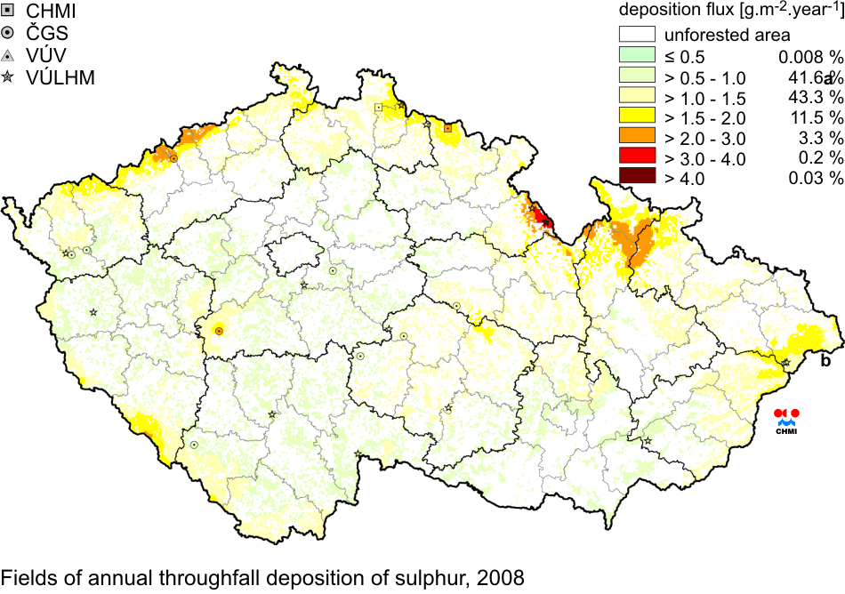 Fields of annual throughfall deposition of sulphur, 2008 |