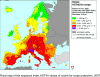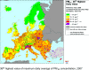 II.4.5. Europe Figs. II.4.5.1–II.4.5.4 present the maps of PM10 and ozone concentrations in the European scale. In case of PM10 the maps show the annual average and the 36th highest daily values, the ozone maps show the 26th highest daily maximum 8-hour value, and the exposure index AOT40 for vegetation. All maps reflect the situation in the year 2008 – i.e. they are the most recent published European maps. The maps were created within the ETC/ACC Consortium (in which CHMI takes part) for the European Environment Agency [34]. The maps were created by the combination of the measured and supplementary data, by merging the rural and urban maps of air pollution (with the exception of AOT40, where there is only a rural map) in 10x10 km resolution. The European maps provide the context for the maps of air pollution in the Czech Republic (even though in 2008 the level of ambient air pollution within the all-European scale was lower than in 2010). In case of PM10 we can see that the Ostrava-Katowice area ranks – together with the Po lowland in Italy and several Balkan areas – among the most polluted areas in Europe. In case of the ground-level ozone, it can be stated the levels measured in the Czech Republic reach the average values corresponding to the geographic position of the Czech Republic in the European continent. Fig. II.4.4.1 Annual average PM10 concentrations, 2008 Fig. II.4.4.2 36th highest value of maximum daily average of PM10 concentration, 2008 Fig. II.4.4.3 26th highest value of maximum daily 8-hour running average of ground-level ozone concentrations, 2008 Fig. II.4.4.4 Rural map of the exposure index AOT40 values of ozone for crops protection, 2008