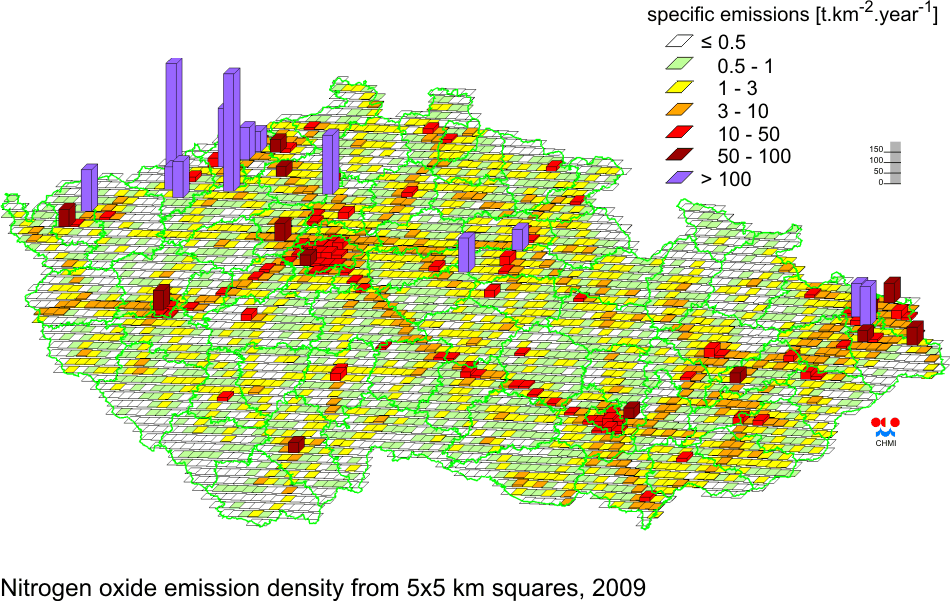 Nitrogen oxides emission density from 5x5 km squares, 2009 |