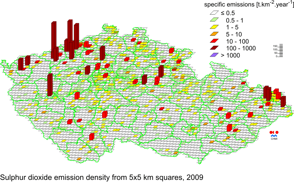 Sulphur dioxide emission density from 5x5 km squares, 2009 |
