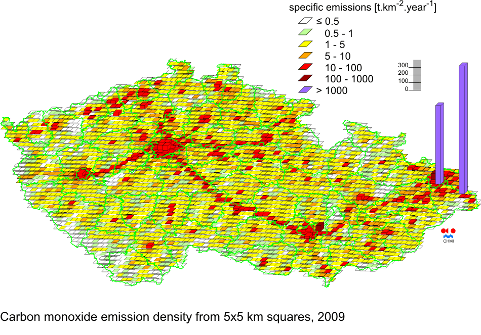 Carbon moNOxide emission density from 5x5 km squares, 2009 |