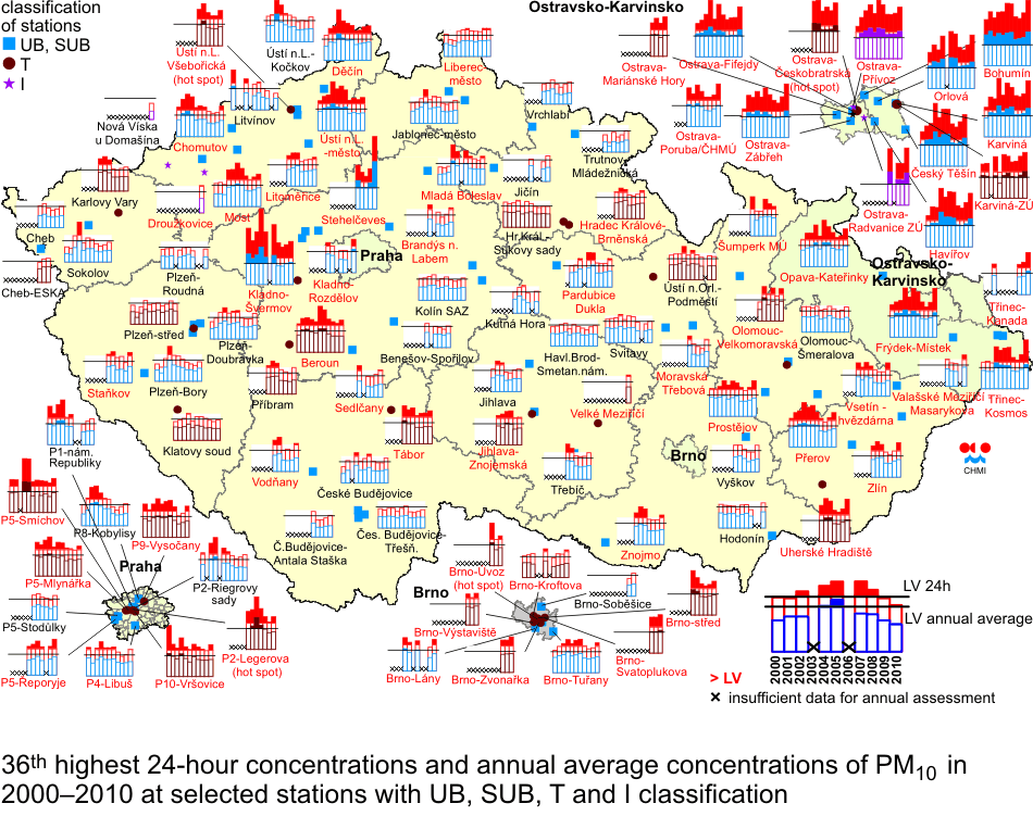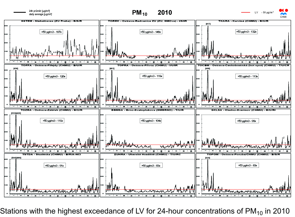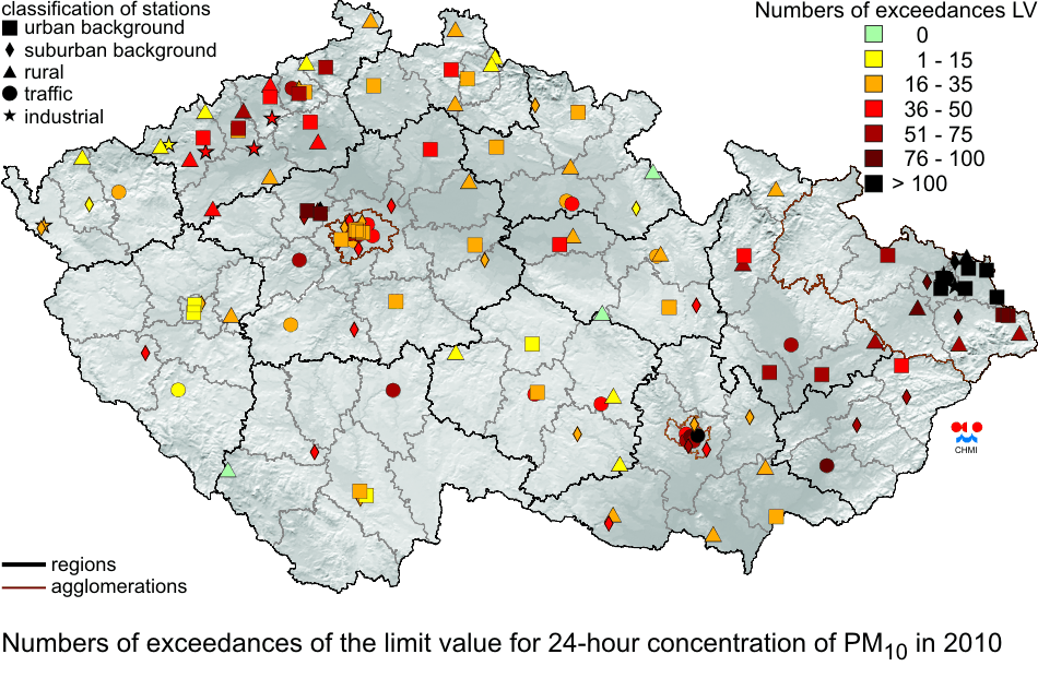 of exceedances of the 24-hour limit value of PM10, Prague agglomeration,