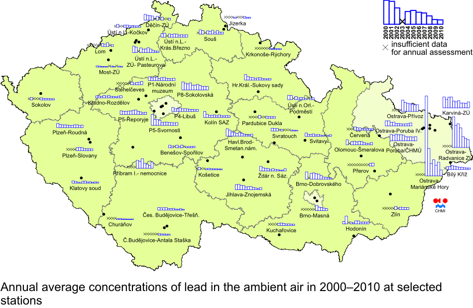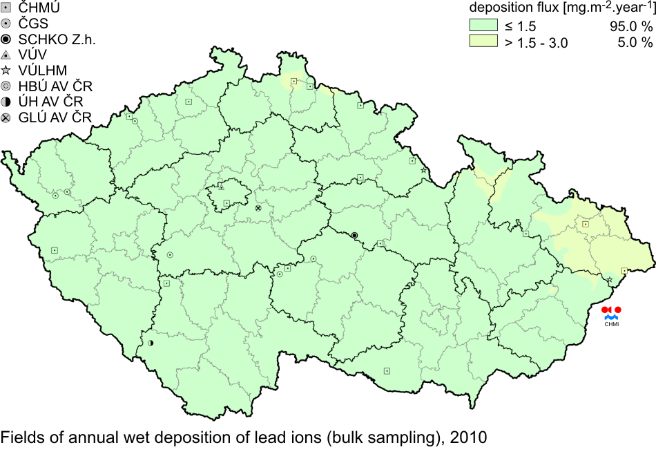 Fields of annual wet deposition of lead ions (bulk sampling), 2010 |