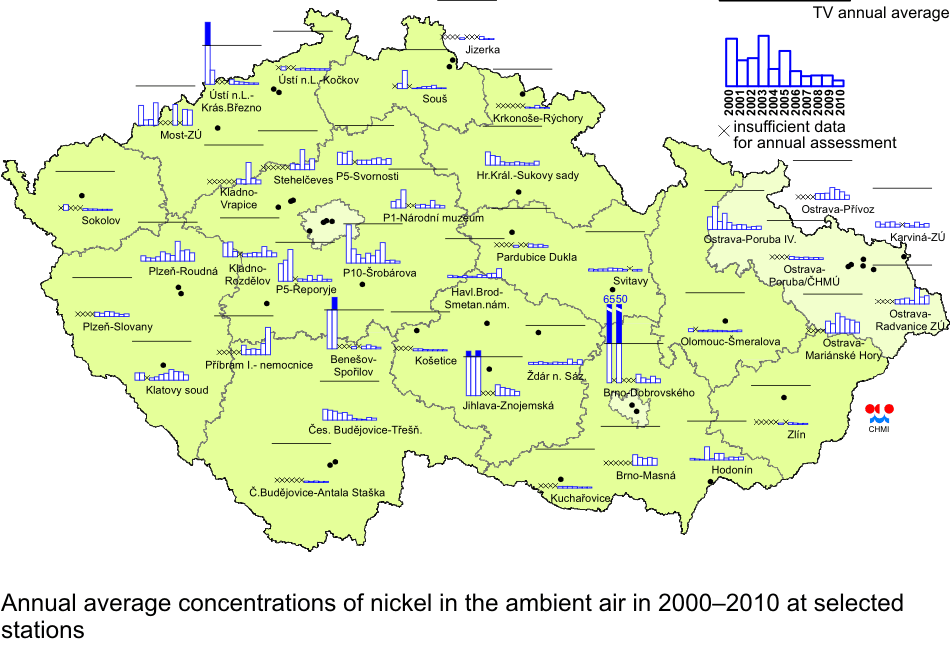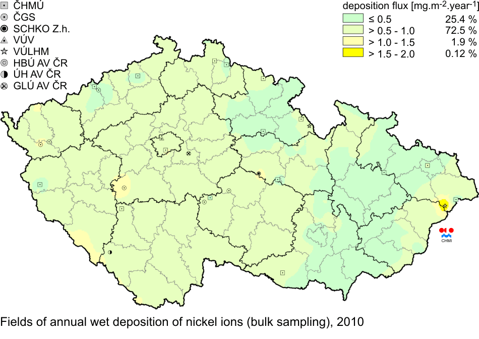 Fields of annual wet deposition of nickel ions (bulk sampling), 2010 |