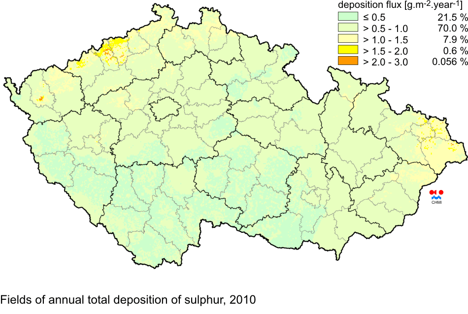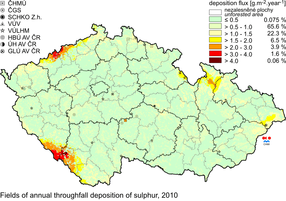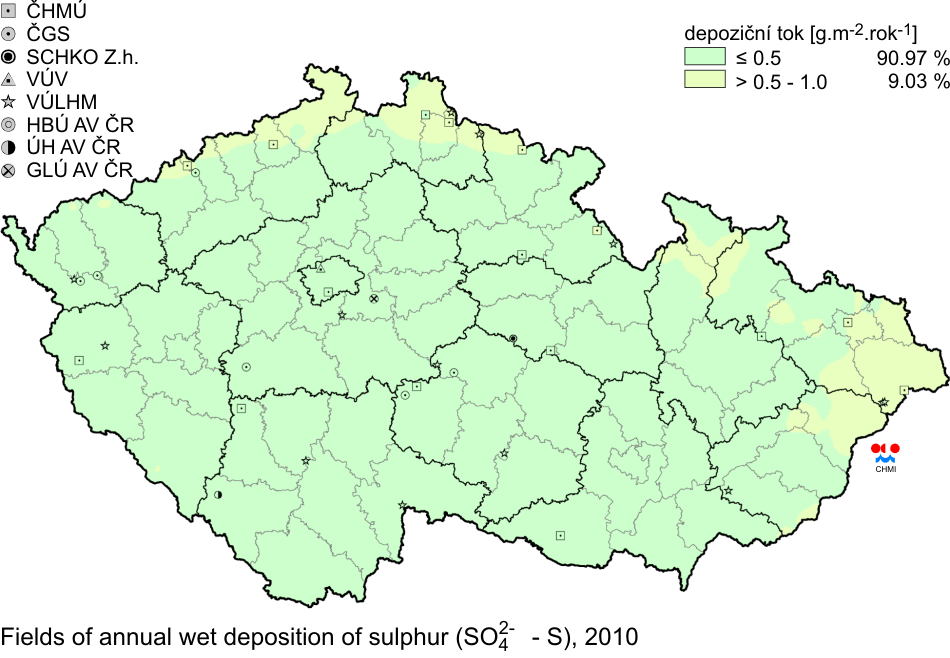 Fields of annual throughfall deposition of sulphur, 2010 |