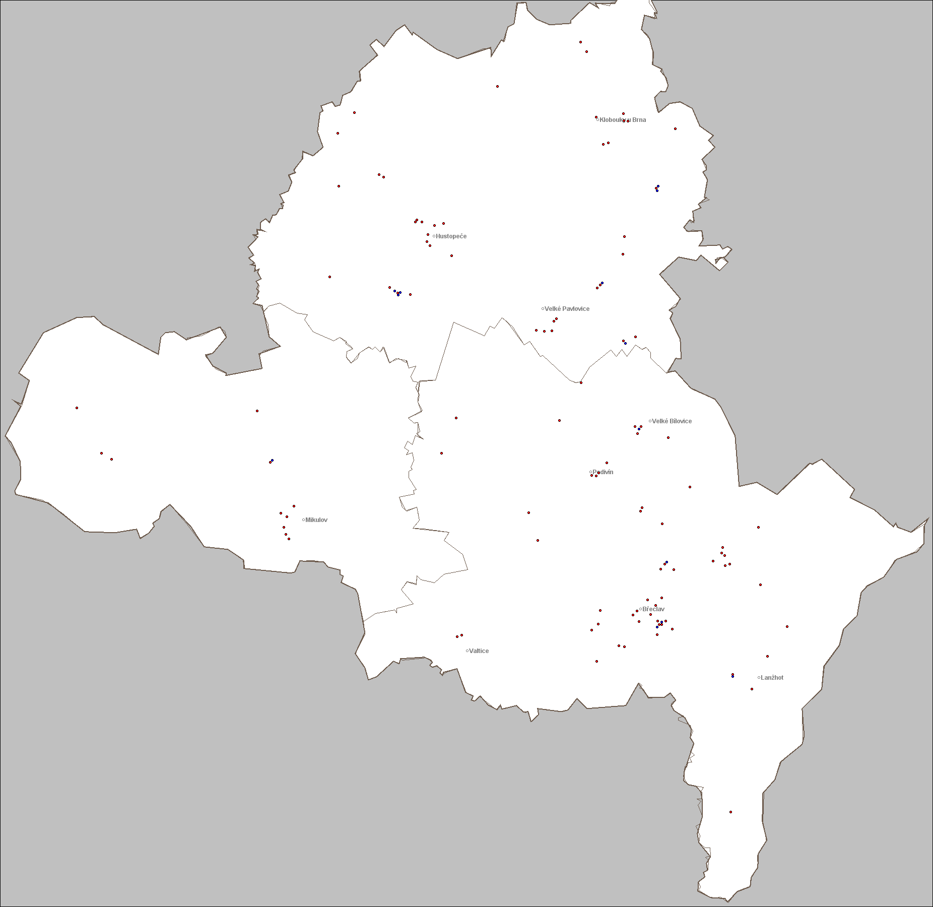 Grafický navigátor vyžaduje JavaScript. Provozovny, které jsou umístěny ve stejné lokalitě a na mapě by se vzájemně překrývaly, jsou označeny bodem s modrou barvou. Jejich skutečné umístění odpovídá souřadnici provozovny s bodem, označeným v místě shluku červenou barvou.