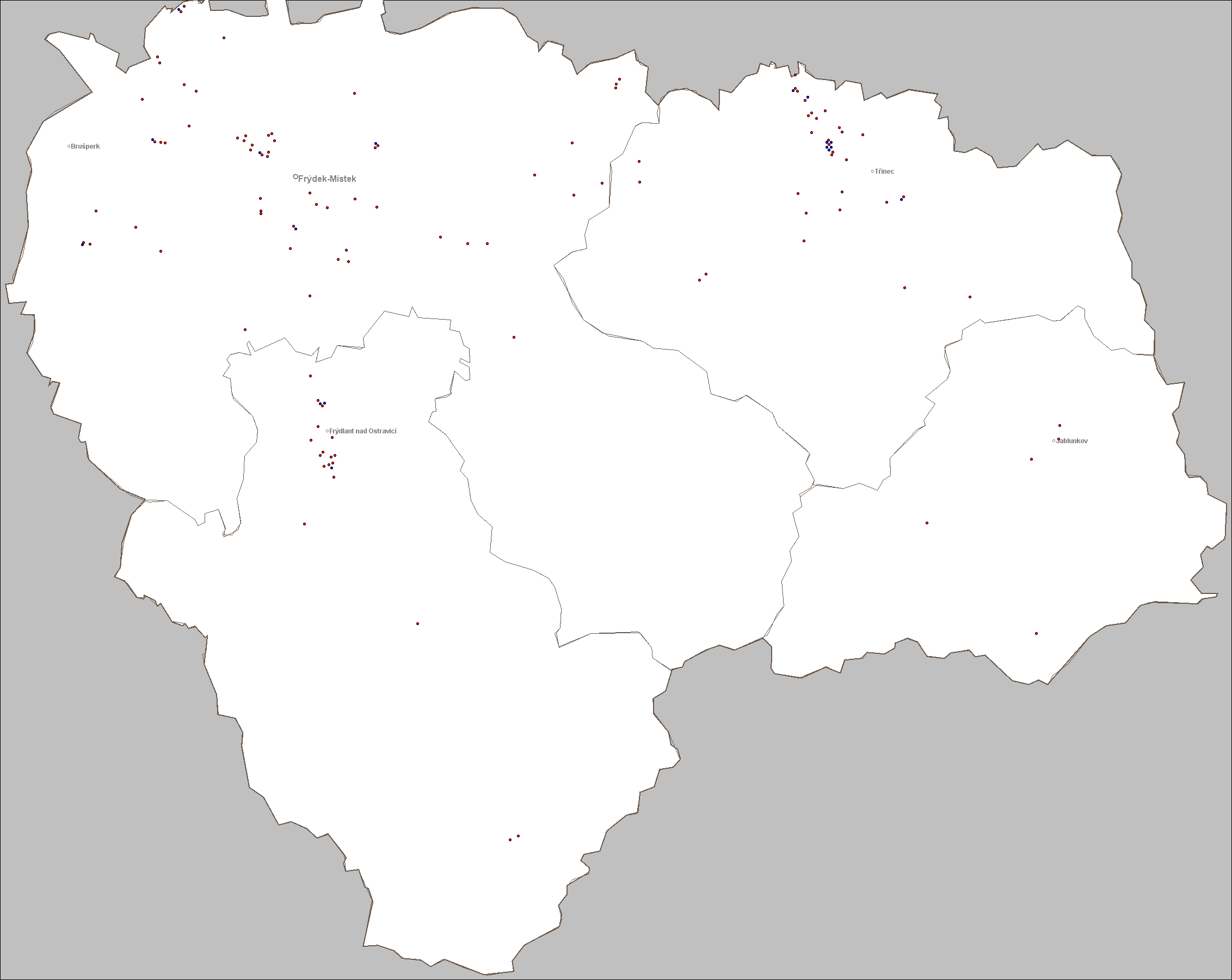 Grafický navigátor vyžaduje JavaScript. Provozovny, které jsou umístěny ve stejné lokalitě a na mapě by se vzájemně překrývaly, jsou označeny bodem s modrou barvou. Jejich skutečné umístění odpovídá souřadnici provozovny s bodem, označeným v místě shluku červenou barvou.