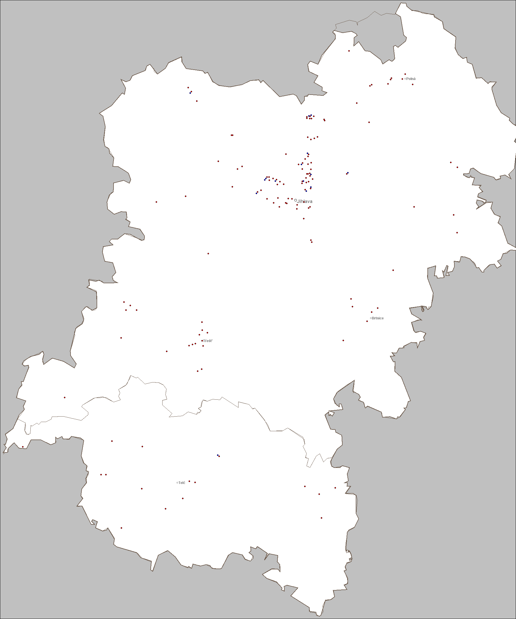 Grafický navigátor vyžaduje JavaScript. Provozovny, které jsou umístěny ve stejné lokalitě a na mapě by se vzájemně překrývaly, jsou označeny bodem s modrou barvou. Jejich skutečné umístění odpovídá souřadnici provozovny s bodem, označeným v místě shluku červenou barvou.