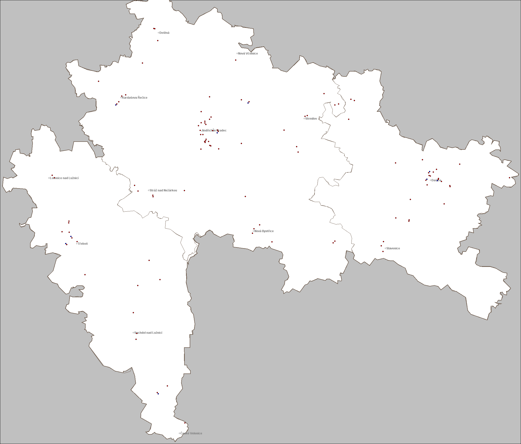 Grafický navigátor vyžaduje JavaScript. Provozovny, které jsou umístěny ve stejné lokalitě a na mapě by se vzájemně překrývaly, jsou označeny bodem s modrou barvou. Jejich skutečné umístění odpovídá souřadnici provozovny s bodem, označeným v místě shluku červenou barvou.