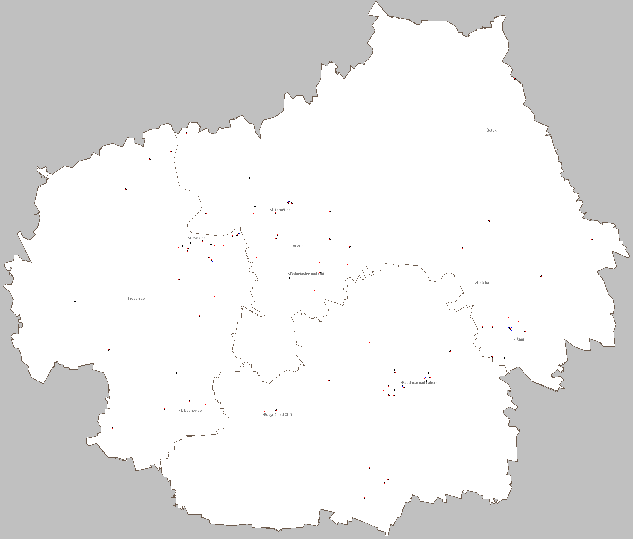 Grafický navigátor vyžaduje JavaScript. Provozovny, které jsou umístěny ve stejné lokalitě a na mapě by se vzájemně překrývaly, jsou označeny bodem s modrou barvou. Jejich skutečné umístění odpovídá souřadnici provozovny s bodem, označeným v místě shluku červenou barvou.