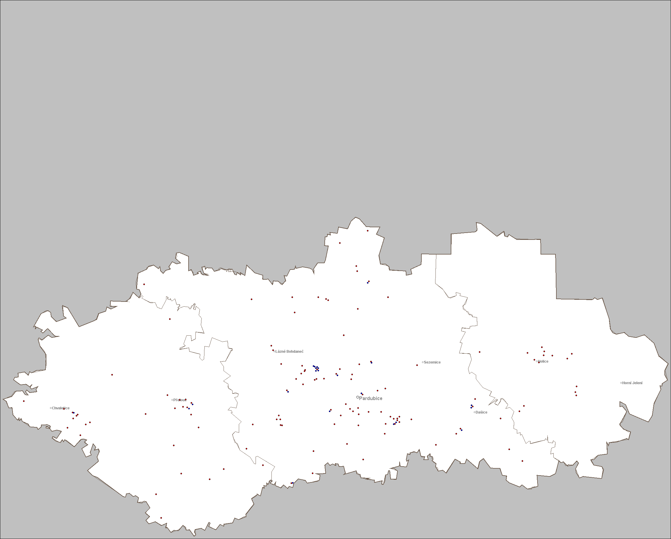 Grafický navigátor vyžaduje JavaScript. Provozovny, které jsou umístěny ve stejné lokalitě a na mapě by se vzájemně překrývaly, jsou označeny bodem s modrou barvou. Jejich skutečné umístění odpovídá souřadnici provozovny s bodem, označeným v místě shluku červenou barvou.