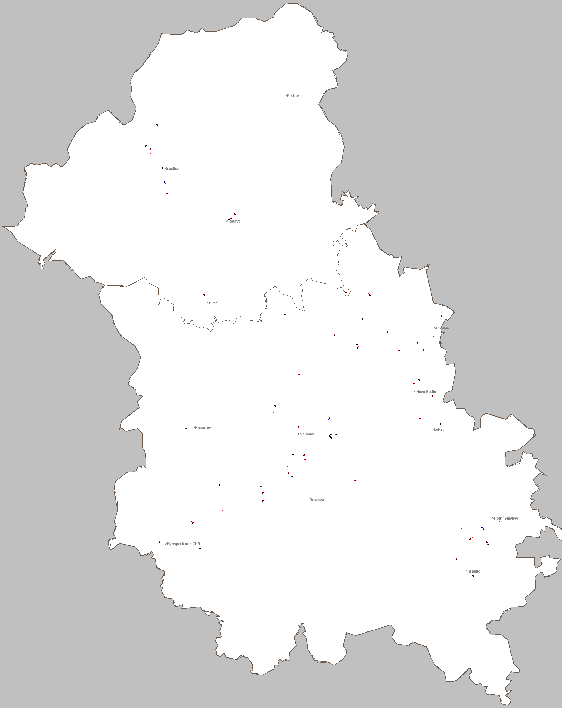Grafický navigátor vyžaduje JavaScript. Provozovny, které jsou umístěny ve stejné lokalitě a na mapě by se vzájemně překrývaly, jsou označeny bodem s modrou barvou. Jejich skutečné umístění odpovídá souřadnici provozovny s bodem, označeným v místě shluku červenou barvou.
