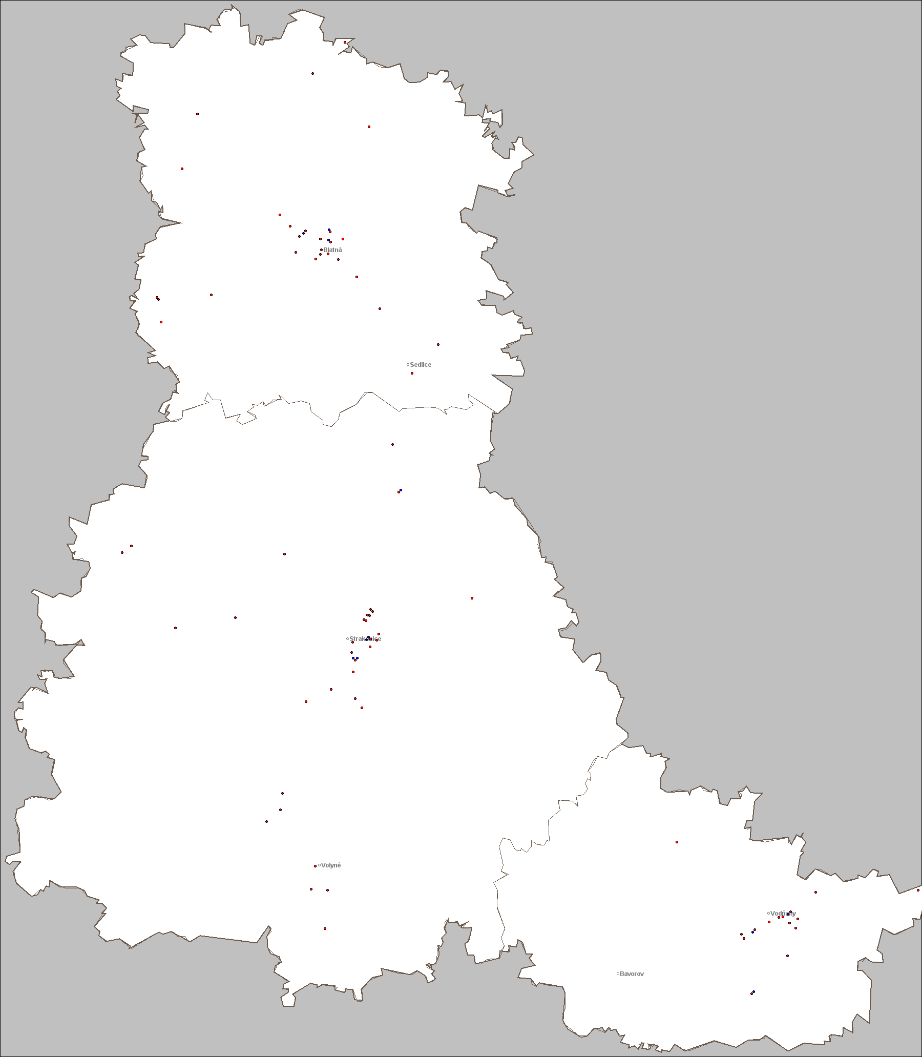 Grafický navigátor vyžaduje JavaScript. Provozovny, které jsou umístěny ve stejné lokalitě a na mapě by se vzájemně překrývaly, jsou označeny bodem s modrou barvou. Jejich skutečné umístění odpovídá souřadnici provozovny s bodem, označeným v místě shluku červenou barvou.